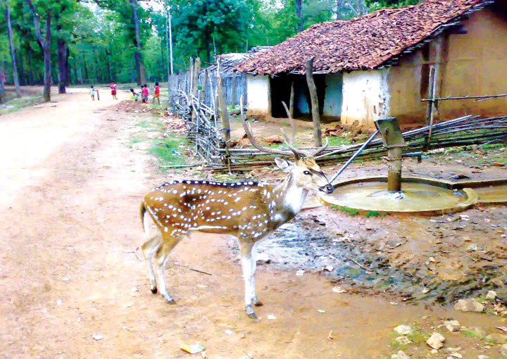 अचानकमार अभयारण्य में एक सुंदर चीतल हैंडपंप के पास खड़ा है, शायद पानी की तलाश में। कच्ची सडक़, आसपास सूखी धरती, बिखरे हुए पत्ते, बच्चे खेलते हुए, फिर एक झोपड़ी। यकीनन इस बस्ती में रहने वाले लोग चीतल को नुकसान नहीं पहुंचाते होंगे, तभी वह निश्चिंत होकर यहां चहलकदमी करते आ गया है। शायद उसे इंतजार है कि कोई आए और उसे पानी पीने में मदद करे। (फोटो- शिरीष दामरे)