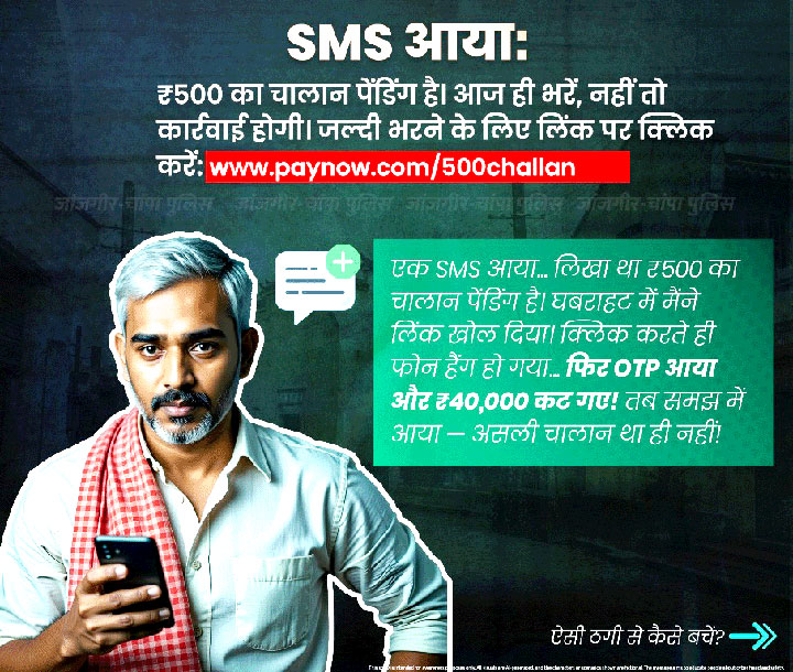 ठग अब ट्रैफिक पुलिस की असली प्रक्रिया की नकल कर रहे हैं। छत्तीसगढ़ पुलिस ने एक केस का उदाहरण देते हुए बताया कि एक व्यक्ति को मेसैज मिला-आपका 500 रुपये का चालान लंबित है, आज ही भरें, वरना कानूनी कार्रवाई होगी। साथ में एक लिंक दिया गया जो बिल्कुल असली वेबसाइट जैसा लग रहा था। घबराहट में व्यक्ति ने लिंक पर क्लिक किया, फोन हैंग हो गया, एक ओटीपी आया और कुछ ही देर में 40,000 रुपये उसके खाते से उड़ गए।