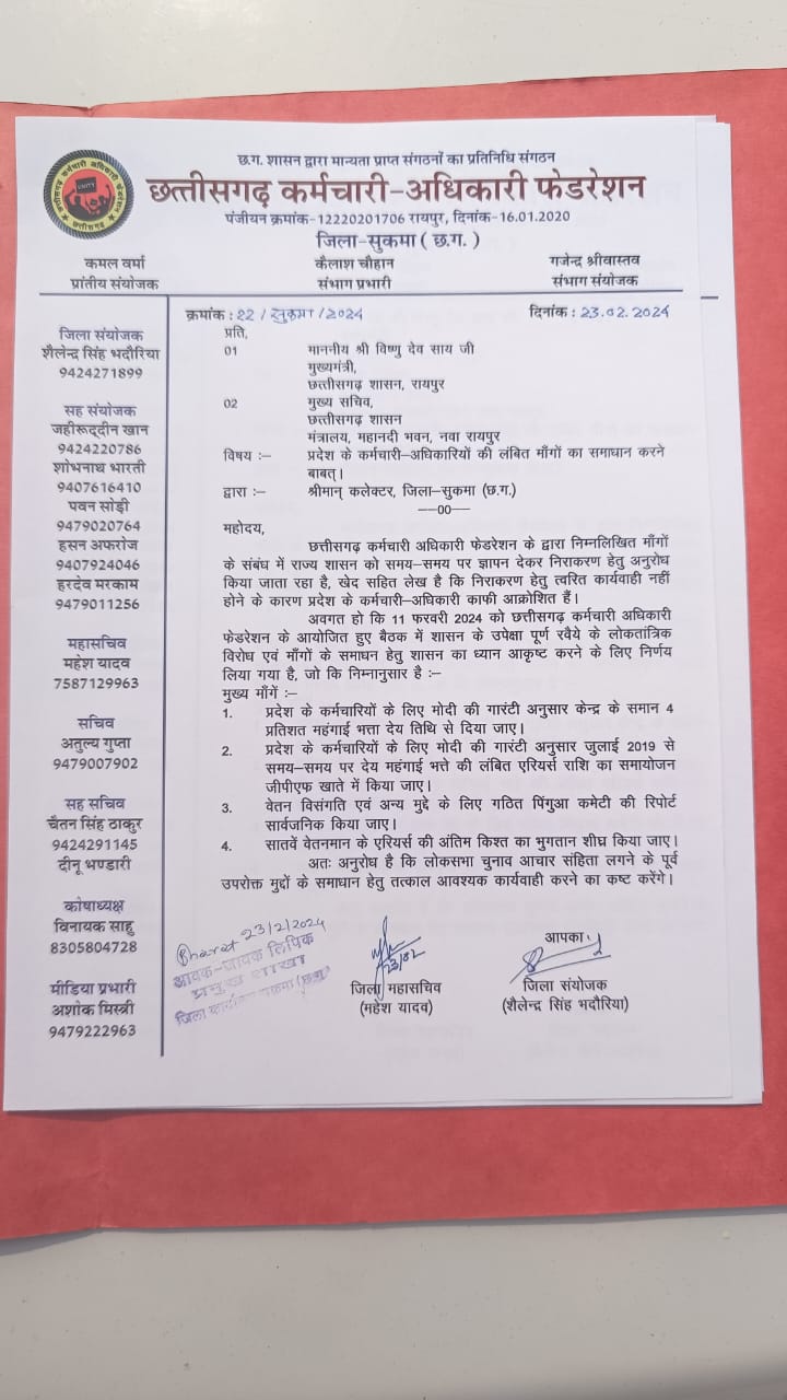 सुकमा, 24 फरवरी। 2023 के चुनाव से पहले छत्तीसगढ़ कर्मचारी, अधिकारी फेडरेशन द्वारा अपनी मांगों को लेकर हड़ताल धरना प्रदर्शन कर अपनी मांगों को लेकर सरकार पर दबाव बनाने की पूरी कोशिश की गई मगर इनकी मांगे पूरी नहीं हुई। विपक्ष में रही भाजपा की सरकार ने वादा किया था कि वह इन मांगों को पूरी करेंगे।