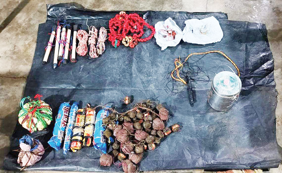 पकड़े गये संदिग्धों के कब्जे से इम्प्रोवाईस आईईडी लगभग 01 किग्रा वजनी, इम्प्रोवाईस आईईडी पॉलीथिन में लपेटा हुआ 500 ग्राम, इम्प्रोवाईस आईईडी पॉलीथिन में लपेटा हुआ 250 ग्राम, फटाक (टाईगर बम) 50, कॉडेक्स वायर 20 मीटर, इम्प्रोवाईस स्वीच होल्डर 06 नग, इम्प्रोवाईस प्रेशर स्वीच (तार के साथ) 3, इलेक्ट्रीक डेटोनेटर 3 बरामद किया गया।
