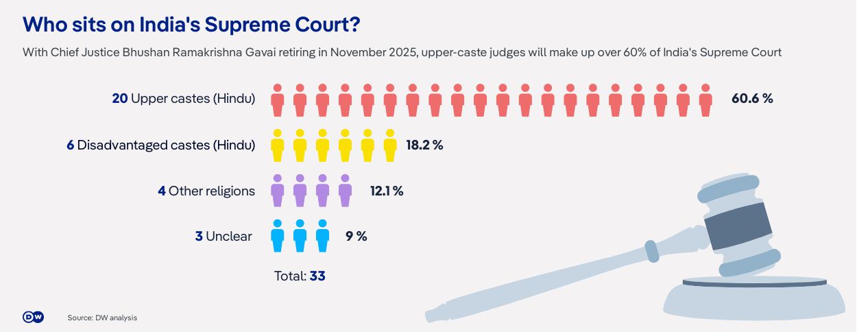 गवई की इस उपलब्धि के बावजूद भारत के कई हिस्सों में आज भी महिलाएं और वंचित समुदाय अपने जीवन में आगे बढ़ने के दौरान ऐतिहासिक पिछड़ापन, पक्षपात और लैंगिक भेदभाव का सामना करते हैं. डीडब्ल्यू ने भारत की सर्वोच्च अदालत में विविधता की स्थिति को ध्यान से देखने की कोशिश की है. इस जांच में जजों के लिंग, धर्म और जाति जैसे पहलुओं का ध्यान रखा गया है.